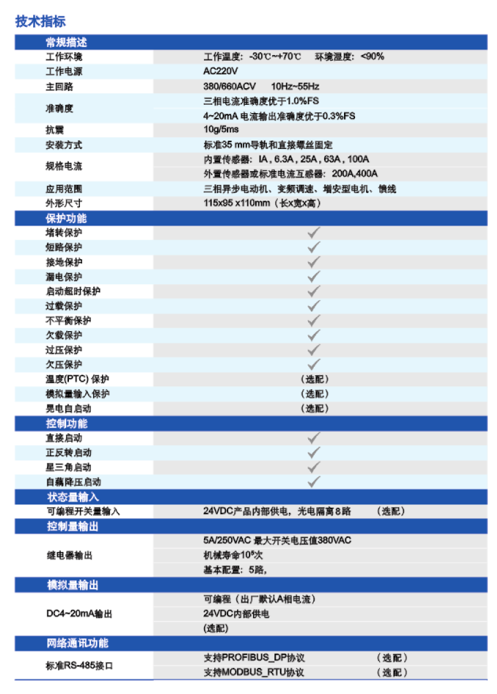產(chǎn)品特點:采用先進(jìn)的數(shù)字控制技術(shù)對電機(jī)的堵轉(zhuǎn)、過載、欠載、缺相、三相不平衡、過壓、欠壓等故障予以保護(hù)。保護(hù)器采用自主知識產(chǎn)權(quán)的遠(yuǎn)程面板技術(shù),主機(jī)與遠(yuǎn)程監(jiān)控系統(tǒng)屏蔽隔離,解決了遠(yuǎn)程控制對主機(jī)的干擾難題??蓪⒅鳈C(jī)面板延伸到異地,實現(xiàn)機(jī)械設(shè)備的現(xiàn)代化管理。功能強(qiáng)大檢測精度高,保護(hù)動作準(zhǔn)確、可靠,可代替電流表、熱過載繼電器、電流互感器和時間繼電器,并具有自診斷維護(hù)、聲光報警輸出等功能,主機(jī)和傳感器融為一體,與公司研發(fā)的新產(chǎn)品向上兼容,采用標(biāo)準(zhǔn)35mm導(dǎo)軌組合安裝,方便使用。