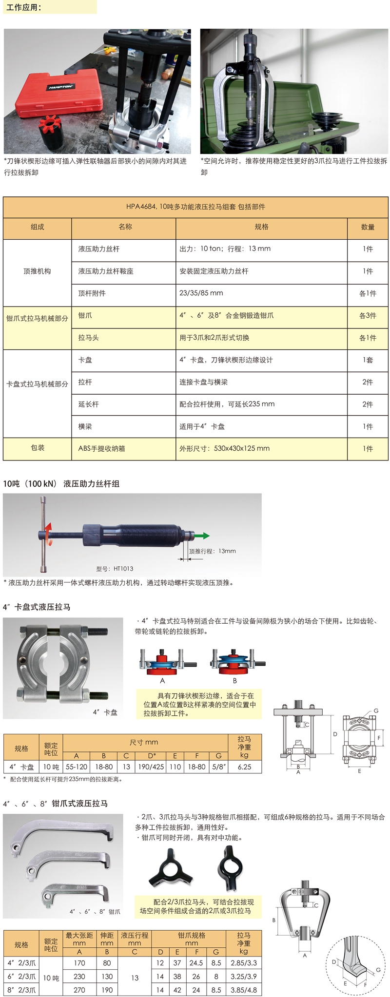 · 可拼裝成4″、6″、8″鉗爪式拉馬(2爪/3爪)和4″卡盤式拉馬。